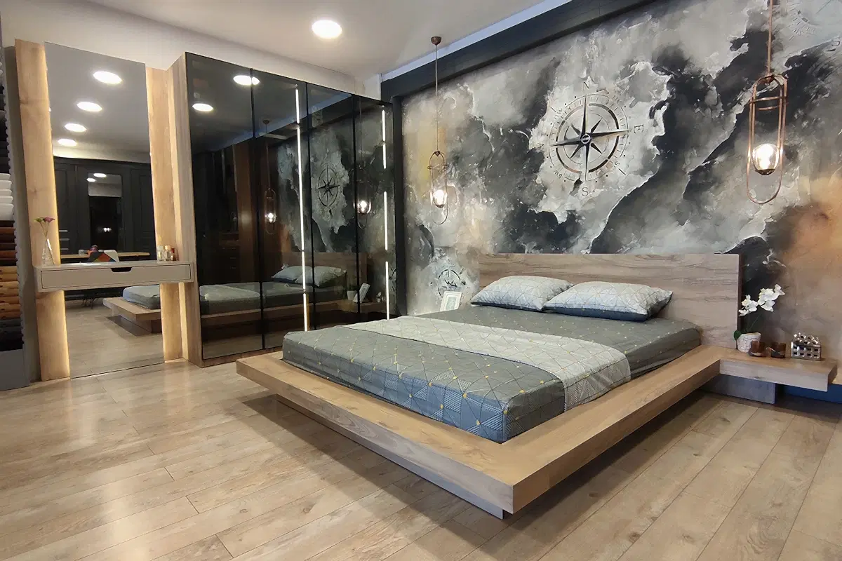 Modena cam dolaplı yatak odası takımı odanıza göre istediğiniz dolap ve karyola ölçülerinde üretilir.